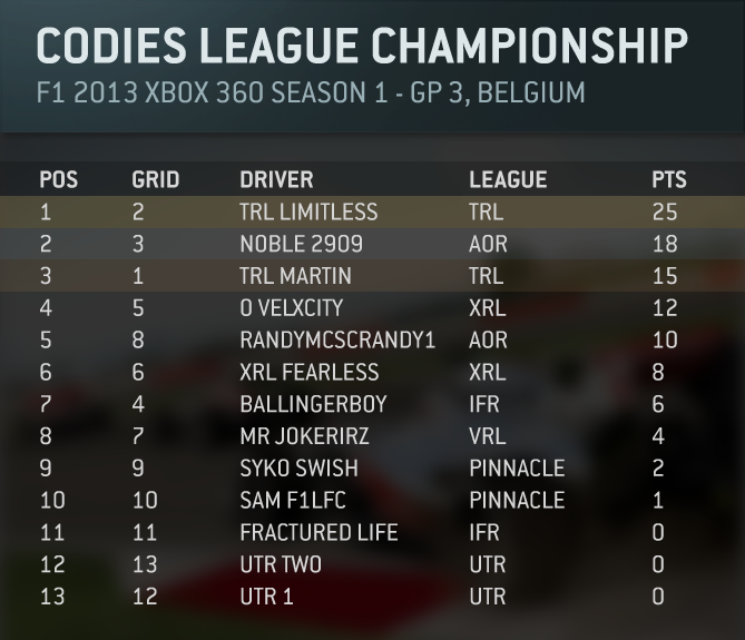 Hatta 0 Posted April 2, 2014 Hello all, welcome back to the forums! As you may know, we have recently started the Codies League Championship; an F1 2013 tournament that pits some of the best leagues around to compete against each other for the top spot. At the moment the Championship is in its first Xbox 360 season but we hope to expand this to PS3 and PC in the near future. For more info on the CLC check out our announcement post on the blog. This topic is basically to discuss all things CLC - We’ll make sure to keep it updated with the latest league standings, events and race round ups!CLC on the Codies BlogAnnouncementMeet The ContendersGP 1 - Australia Race Round UpGP 2 - Spain Race Round Up CLC Participating LeaguesAORUTRTRLXRLVRLIFRPinnacle CLC CalendarGP 1 Australia - 19/03/13GP 2 Spain - 26/03/13GP 3 Belgium - 02/04/13GP 4 USA - 09/04/13GP 5 Brazil - 16/04/13 The next race is at 8PM (UK time) on Wednesday 9th April. You can watch it live on Twitch here. Share this post Link to post Share on other sites